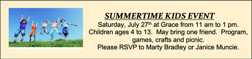 Saturday, July 27th at Grace from 11 am to 1 pm. Children ages 4 to 13. May bring one friend. Program, games, crafts and picnic.
