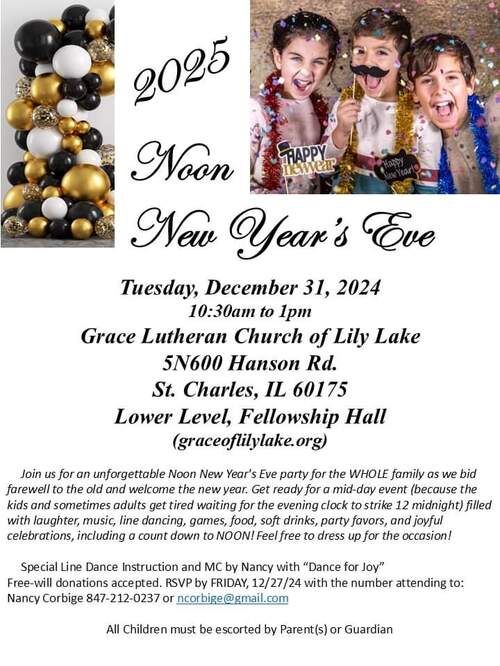 Tuesday, December 31, 2024 10:30-1pm. Join us for an unforgettable Noon New Year's Eve Party for the WHOLE family as we bid farewell to the old and welcome the new year. Line dancing, face painting, games, soft drinks, party favors, and more.