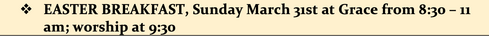 EASTER BREAKFAST, Sunday March 31st at Grace from 8:30 – 11 am; worship at 9:30